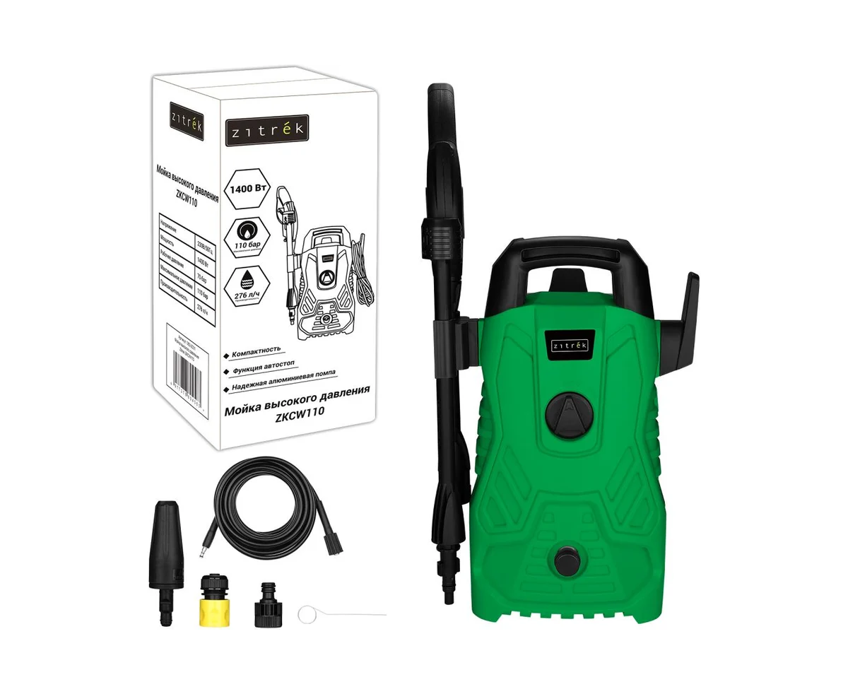 Мойка высокого давления Zitrek ZKCW110 предназначена для мытья транспортных средства (машин, лодок, мотоциклов и т.д.), очистки загрязненных поверхностей при помощи чистой воды под высоким давлением (при необходимости с добавлением моющих средств) в бытовых условиях. Мойка оснащена функцией Автостоп. Надежная алюминиевая помпа имеет небольшой вес и не подвергается процессу коррозии. Мойка может забирать воду из любого подходящего источника - водопровода, садовой бочки или водоема.