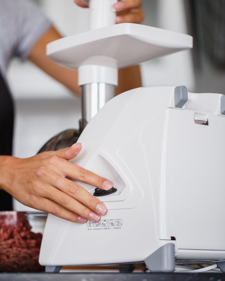 мощность 1500Вт, производительность 1.7кг/мин; количество скоростей 1; реверс; насадка для колбас; насадка для кеббе; насадка для соков; насадка-терка; насадка для шинковки; материал лотка пластик; цвет белый