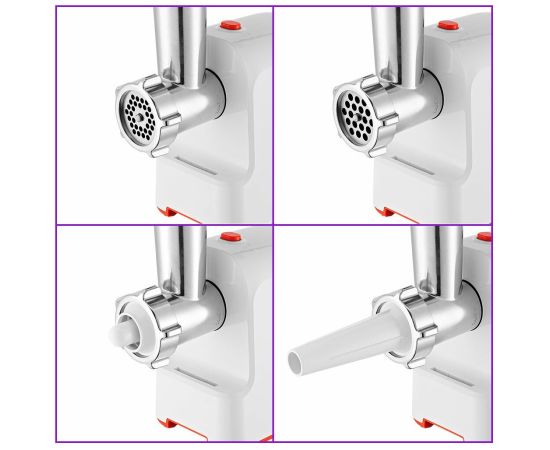 Комплектация 1. Моторный блок — 1 шт. 2. Загрузочный блок — 1 шт. 3. Загрузочный лоток — 1 шт. 4. Толкатель — 1 шт. 5. Шнек — 1 шт. 6. Насадка для кеббе — 1 шт. 7. Крышка насадки для кеббе — 1 шт. 8. Насадка для колбас — 1 шт. 9. Нож — 1 шт. 10. Кольцевая гайка — 1 шт. 11. Решетка с отверстиями 5 мм — 1 шт. 12. Решетка с отверстиями 7 мм — 1 шт. 13. Руководство по эксплуатации — 1 шт. 14. Коллекционный магнит — 1 шт.* *опционально