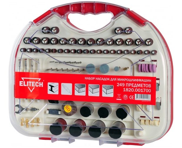 Набор оснастки (249 предметов) Elitech 1820.001700 подходит для гравировальных машин. Содержит насадки различной зернистости и формы для резки, шлифовки и полировки различных материалов: древесины, металла, пластика и т.д. Поставляется в удобном пластиковом кейсе.
