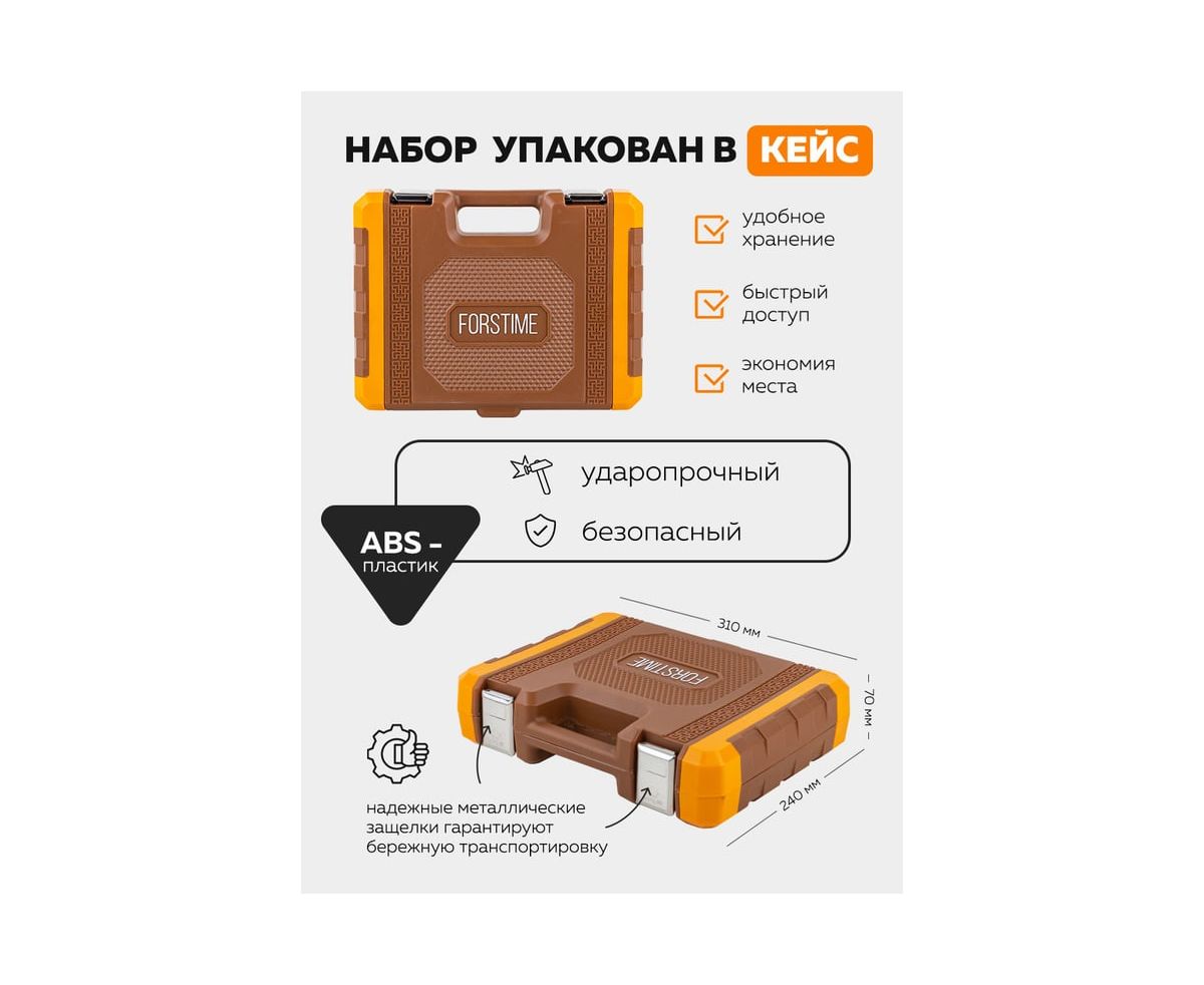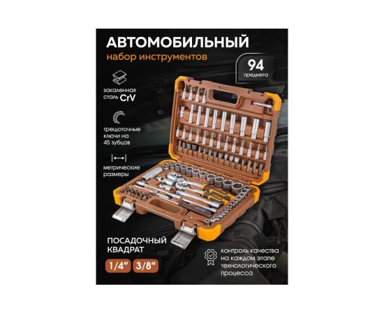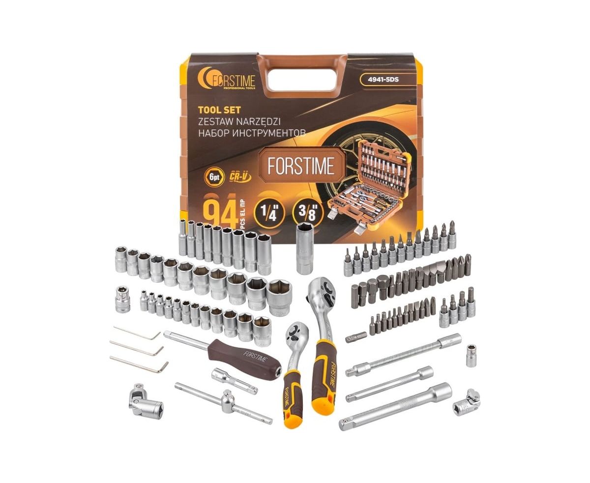 Набор инструментов FORSTIME состоит из 94 предметов на 1/4" и 3/8" в кейсе и включает в себя практически всё, что необходимо для большинства ремонтных работ - как в гараже обычного автолюбителя, так и в боксе специализированного сервиса.