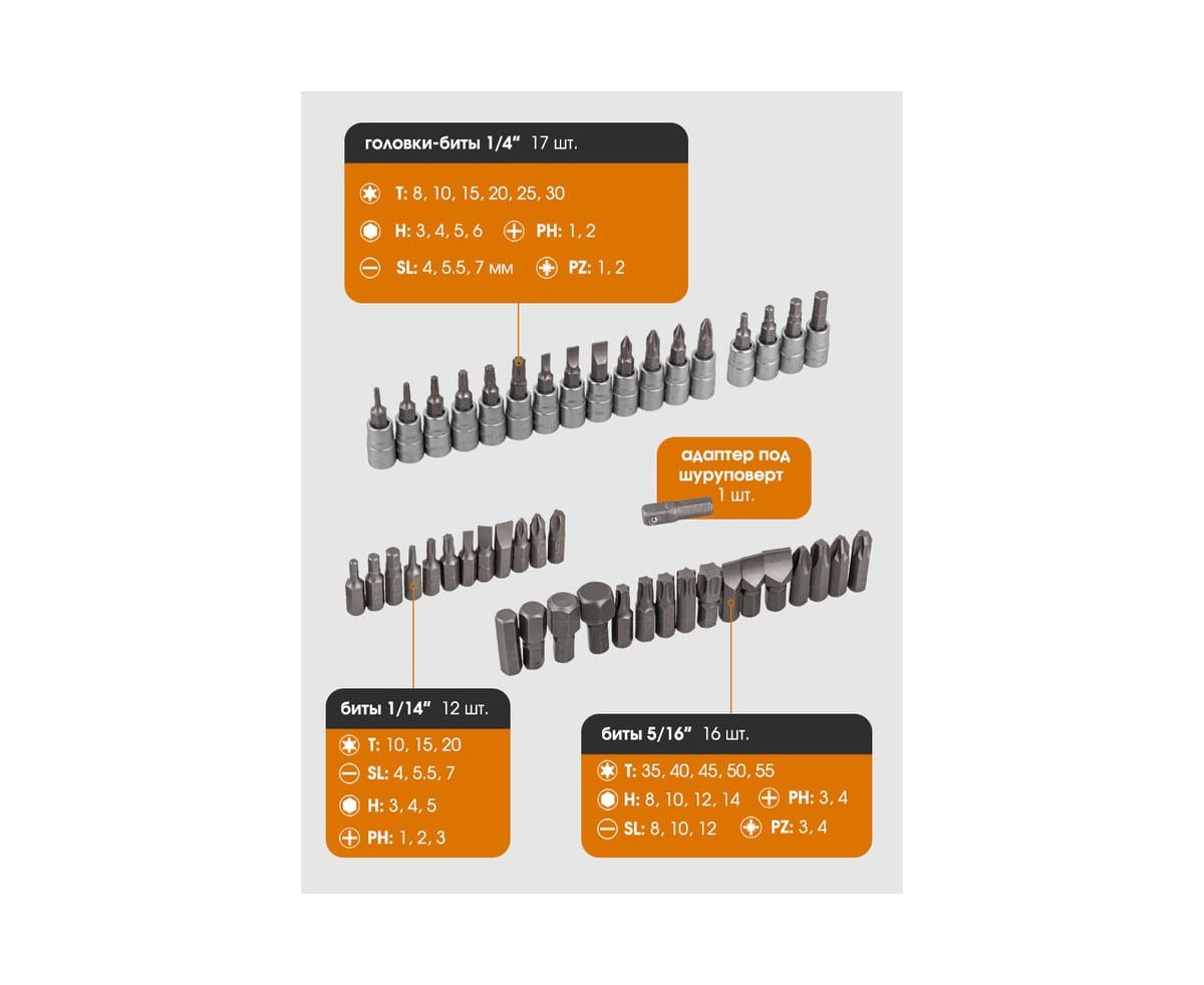 Универсальность. В представленный набор инструментов 94 предмета входят множество типоразмеров торцевых насадок и бит, а также максимально полезный в работе комплект из 3 единиц шестигранных Г-образных ключей.