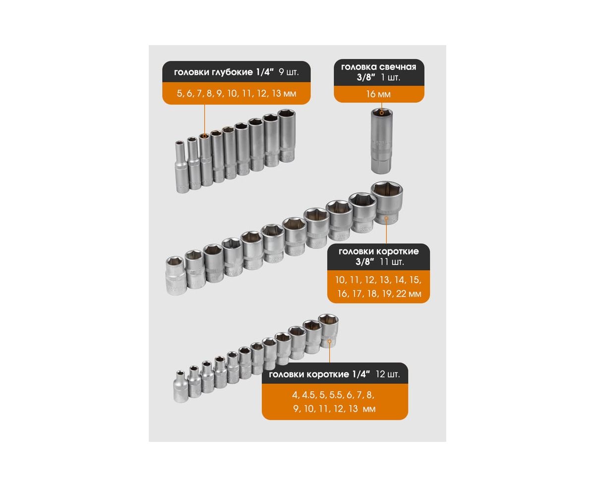 Посадочный квадрат: 1/4" и 3/8". Тип головок: 6-гранные, короткие.
