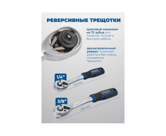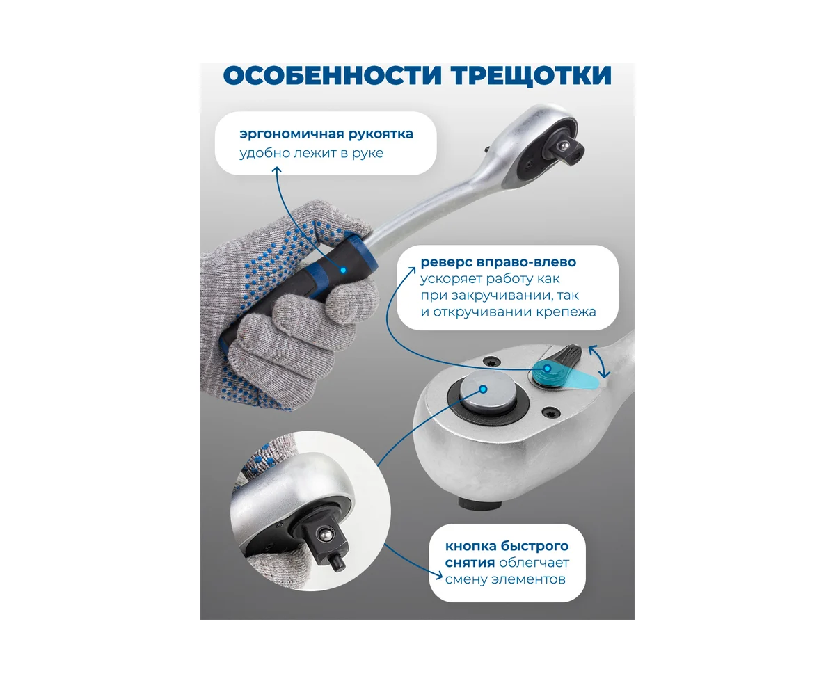 Многофункциональность. Набор из 108 предметов, включая торцевые головки различных размеров, свечные головки, головки-биты, удлинители, шарнирные карданы и шестигранные ключи. Это позволяет справиться с широким спектром задач — от обслуживания автомобиля до сборки мебели.