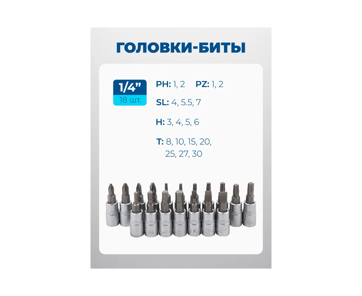 - Головки-биты 1/4": H3, H4, H5, H6; T8, T10, T15, T20, T25, T27, T30; SL4, SL5.5, SL7; PH1, PH2; PZ1, PZ2 - 18 шт.;