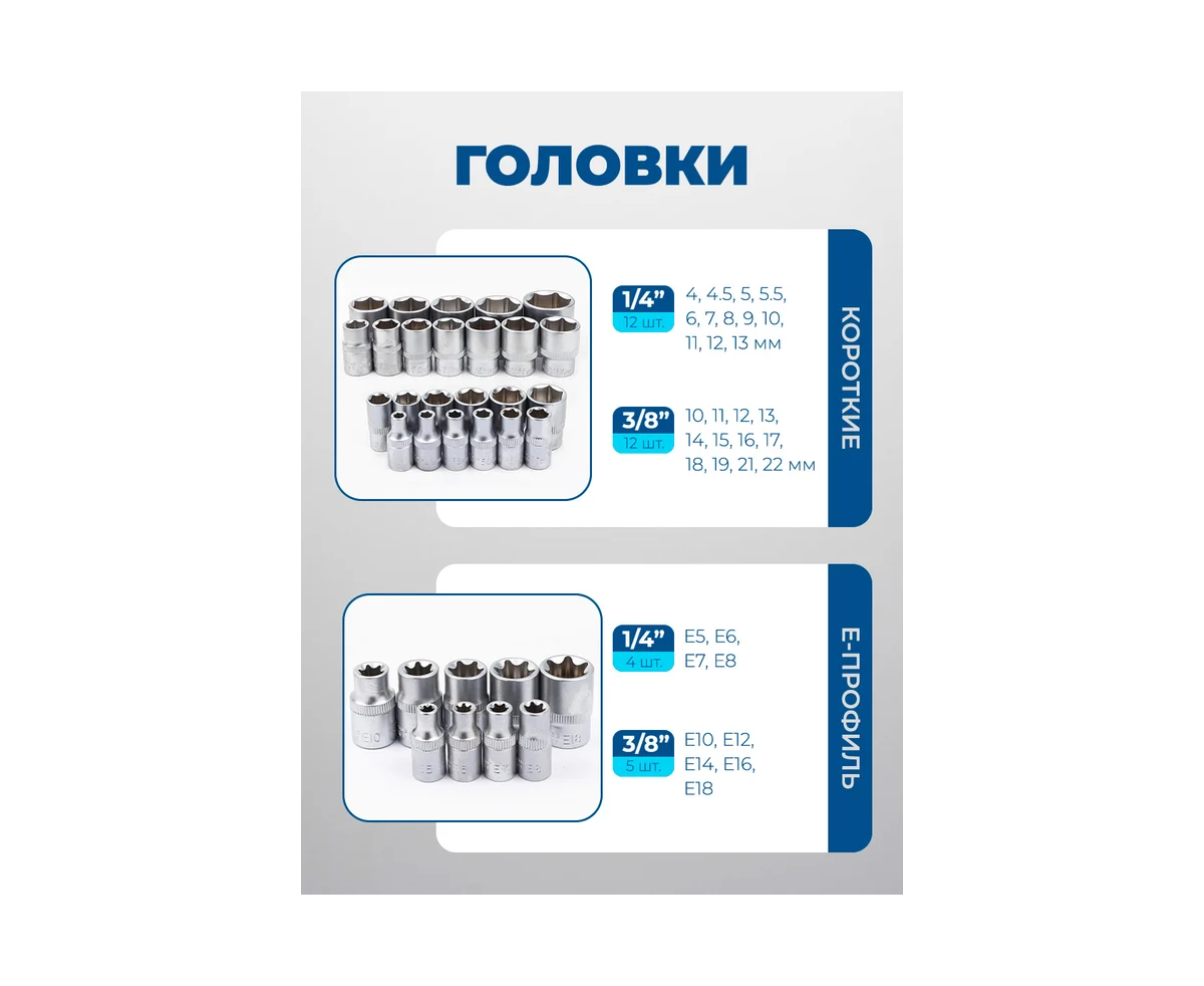 - Головки 3/8" E-тип: E10 , E12, E14, E16, E18 - 5 шт.