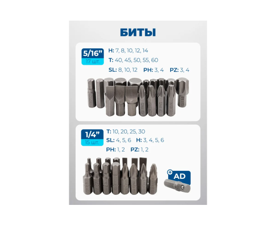 - Биты 5/16": H7, H8, H10, H12, H14; T40, T45, T50, T55, T60; SL8, SL10, SL12; PH3, PH4; PZ3, PZ4 - 17 шт.;