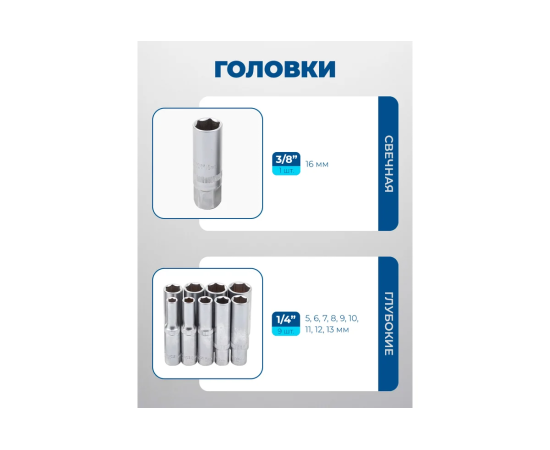 - Головки 1/4": 4, 4.5, 5, 5.5, 6, 7, 8, 9, 10, 11, 12, 13 мм. - 12 шт.;