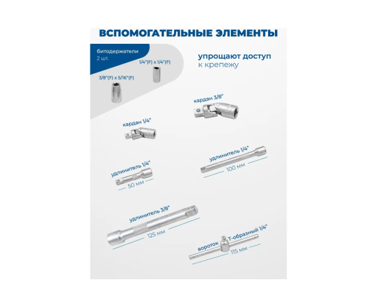 Универсальность. Благодаря наличию в наборе различных посадочных размеров (1/4 дюйма и 3/8 дюйма), инструменты подходят для выполнения как мелких, так и крупных ремонтных работ. Набор будет хорошим помощником в любой ситуации — замена свечей зажигания, работы с подвеской автомобиля или мелкие бытовые починки.