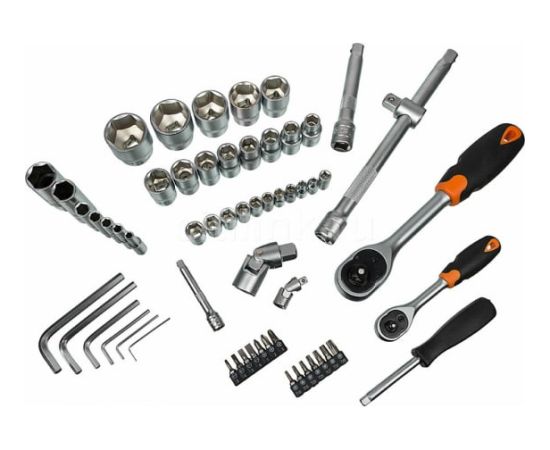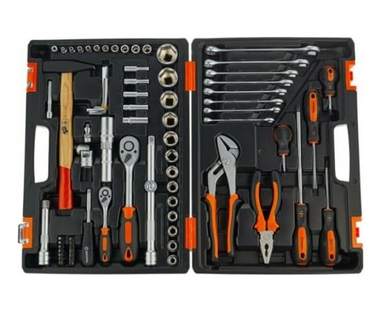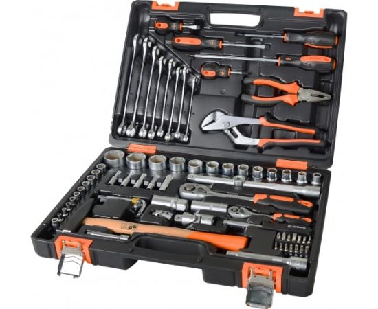 Набор инструментов пластиковый кейс 76 предметов включает в себя обширный комплект снаряжения, необходимого для слесарных работ. Большое количество торцевых головок и вставок охватывает наиболее популярные типоразмеры крепежа.