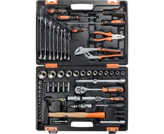 Для слесарных работ в комплекте имеются пассатижи и клещи, а также молоток. Кейс выполнен из пластика, оснащен раздельными петлями и двумя металлическими замками для безопасной транспортировки.
