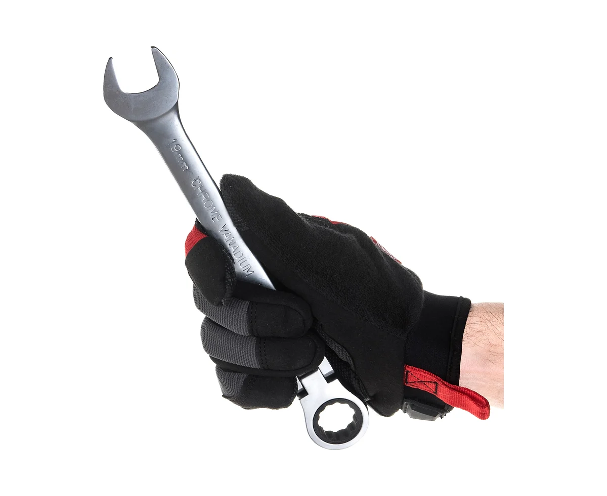 Накидная сторона ключей обеспечивает надежное сцепление и позволяет легко закручивать и выкручивать элементы. Трещоточный механизм увеличивает скорость работы, так как не требует постоянного переставления ключа.