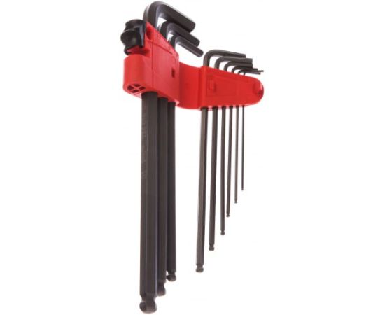 Набор Г-образных ключей с шариком Wera WE-022086 представляет собой комплект из 9-ти угловых ключей, которые предназначены для закручивания и откручивания изделий с шестигранным профилем. У них простая конструкция и они удобны в работе. Ключи имеют профиль Hex-Plus - довольно большие опорные поверхности, поэтому головка винта не разрушается во время работы.