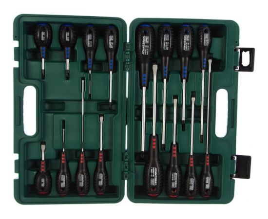 Набор отверток состоит из 16 инструментов - восемь отверток, имеющих прямой профиль и восемь отверток, снабженных крестовой головкой. Инструменты разного профиля отличаются друг от друга цветными вставками на корпусе рукоятки. Каждая отвертка подписана и имеет отверстие для подвески.