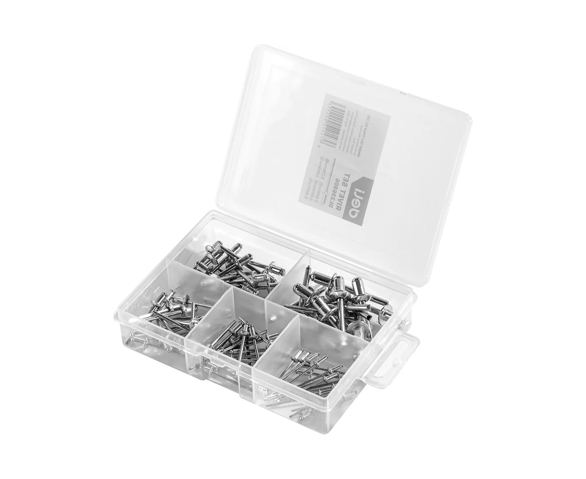 Набор заклепок DELI DL236906 75 шт. 98419 предназначен для работы с заклёпочниками типа DL236910 и другими. Пять различных размеров позволяют решать широкий спектр задач, а пластиковый бокс с отдельными ячейками позволяет удобно хранить заклёпки и не допускает их перемешивания.
