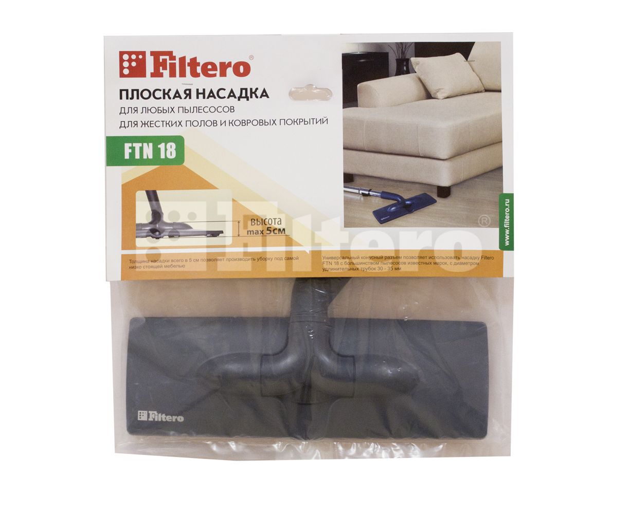 Плоская и маневренная универсальная насадка Filtero FTN 18 предназначенная для уборки ламинированных и паркетных полов, или ковровых покрытий с мелким ворсом.