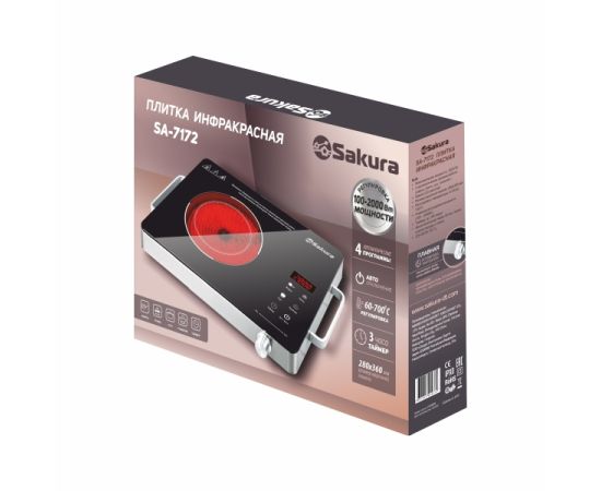 Дополнительные характеристики: размер прибора - 280*360*65мм, максимальная нагрузка на конфорку 10кг, защита от прегрева, яркий дисплей, удобные ручки для переноски плиты, , подходит для любой посуды с плоским дном
