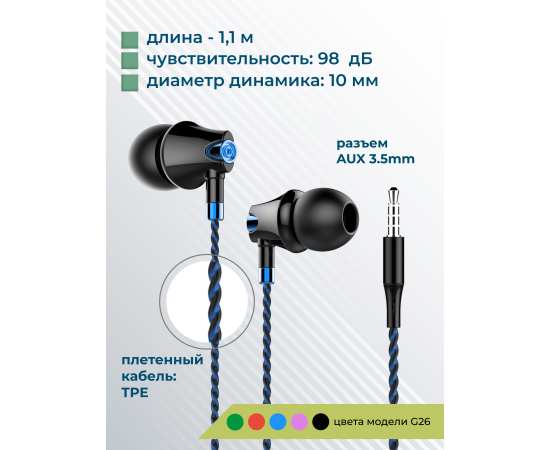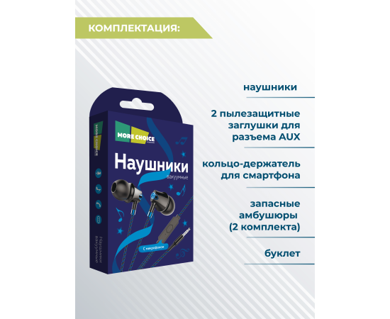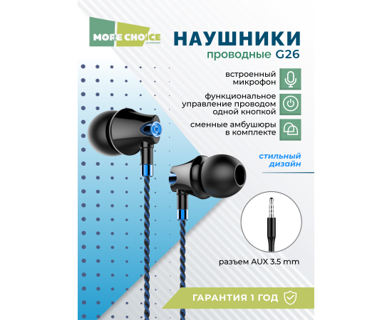 Наушники вакуумные AUX разъём с МК без рег.громкости длина 1.1м More Choice G26 (Blue)