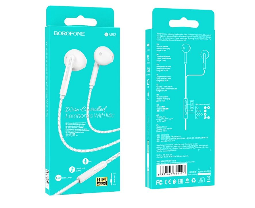 Наушники вкладыши AUX разъём с МК длина 1.2м Borofone BM63 (White)