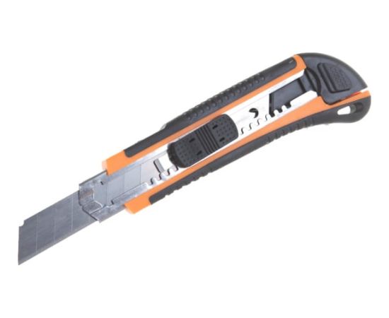 Нож оснащен двухкомпонентным корпусом и автоматическим фиксатором лезвия.