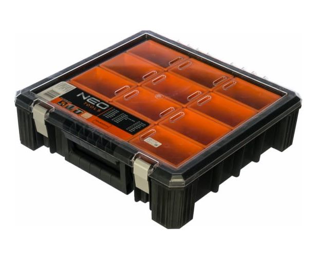 Органайзер с отделениями, 40x40x12см NEO 84-130 - универсальное приспособление для мастерской или гаража. Модель изготовлена из пластмассы и металла и оснащается противоударными уголками, что обеспечивает надежность во время транспортировки. Алюминиевые замки препятствуют случайному выпаданию крепежа во время транспортировки. Крышка органайзера выполнена из поликарбоната.
