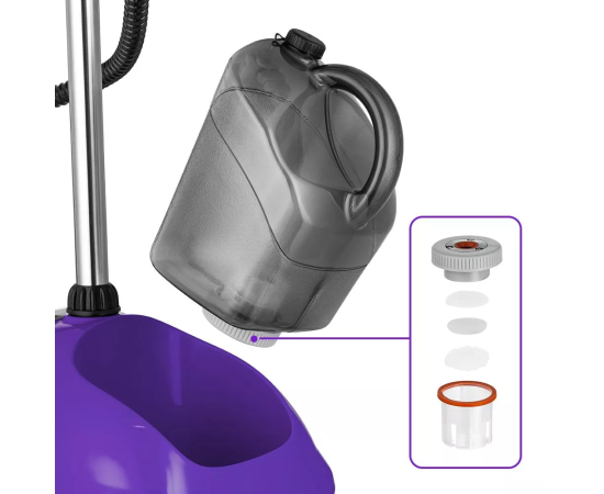 Ёмкость съёмного резервуара - 2,2 л. Такого объёма хватит на 48 мин беспрерывного отпаривания. Время нагрева составляет всего 45 сек. Встроенный блок фильтров очищает воду, которая подаётся в бойлер, что существенно увеличивает срок службы прибора.