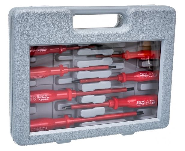 Все компоненты из набора изолированных отверток имеют диэлектрическое покрытие для работы под напряжением до 1000В.