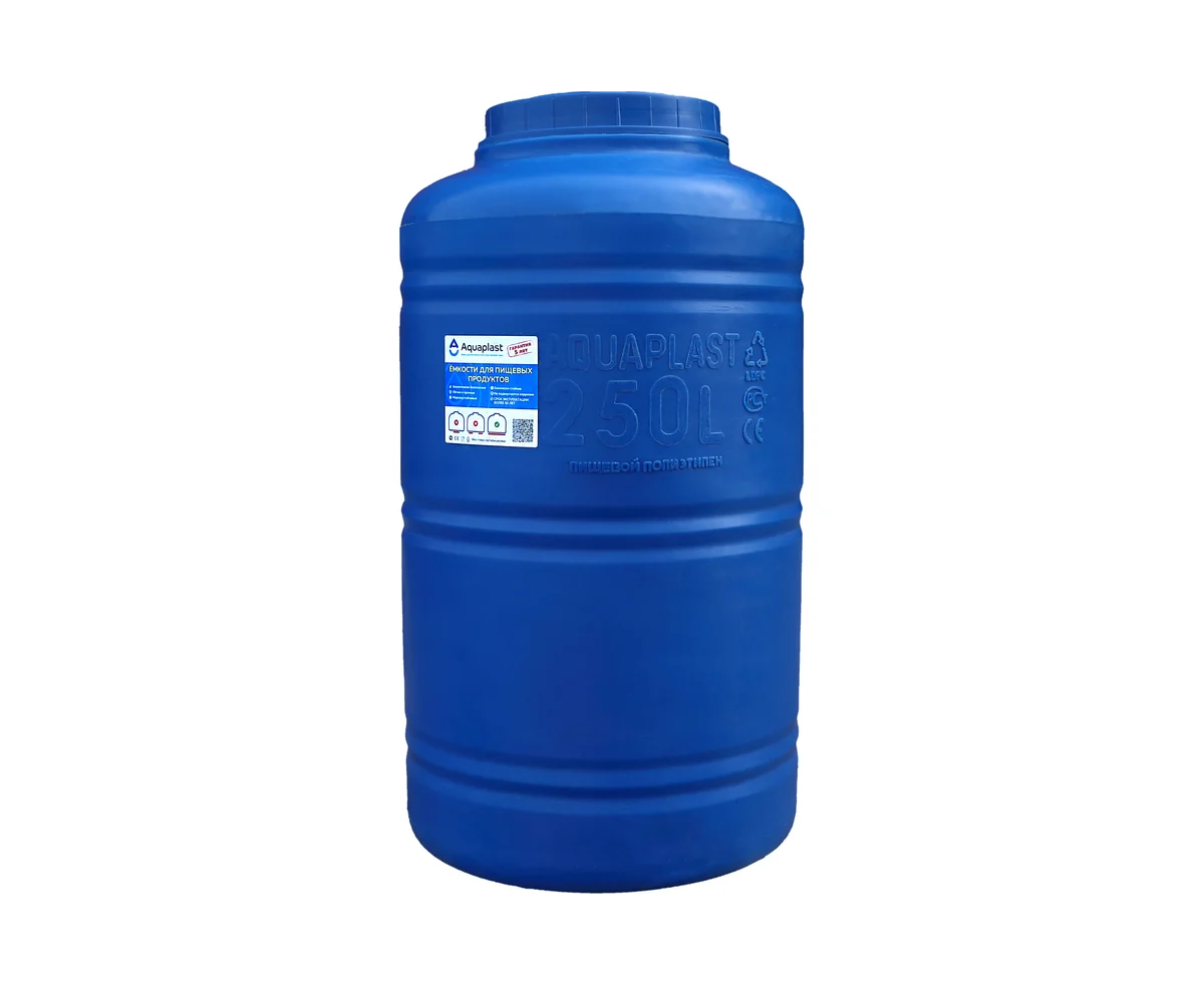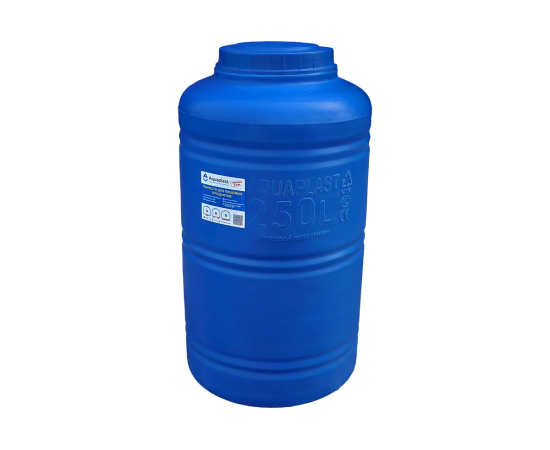 Овально-вертикальная емкость AQUAPLAST 250 л, синяя 4630017951802 предназначен для стационарного хранения питьевой воды, пищевых продуктов, агрессивных сред (по согласованию), дизельного топлива.