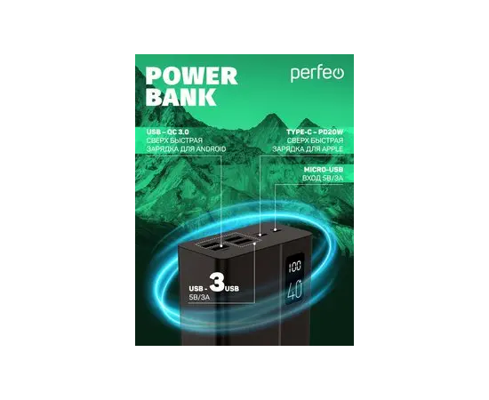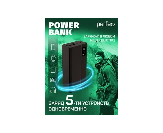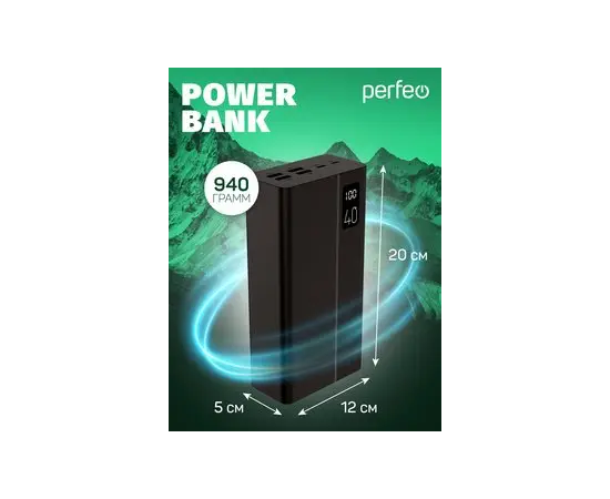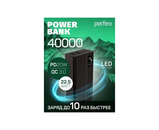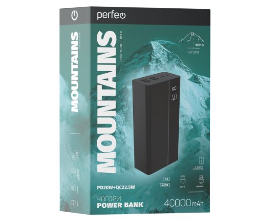 Пауэрбанк Perfeo MOUNTAINS 40000 mAh/LED дисплей/PD + QC 3.0/Type-C/4 USB/Выход: 3A, max 22.5W(цвет- черный)