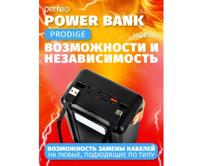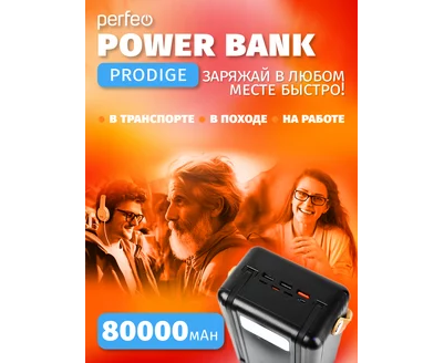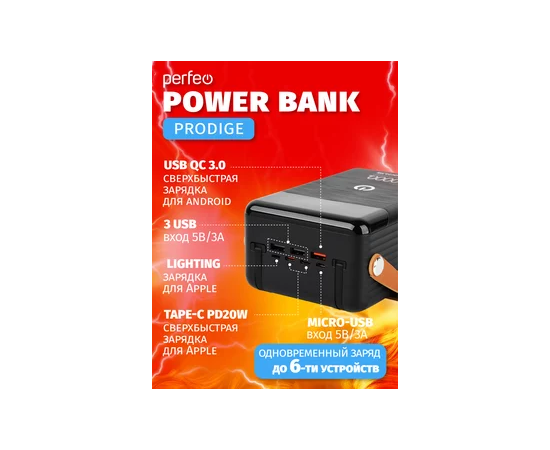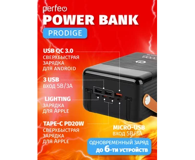 Повербанк Perfeo PRODIGE 80000 mAh/LED/PD + QC 3.0/Type-C/Lightning/3 USB/Выход: 5A, max 22.5W, черный