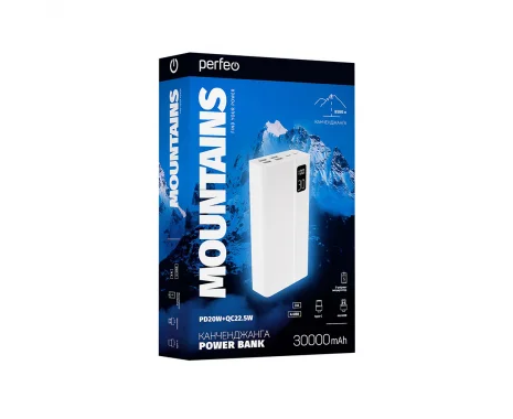 Повербанк Perfeo MOUNTAINS 30000 mAh/LED дисплей/PD + QC 3.0/Type-C/4 USB/Выход: 3A, max 22.5W/White
