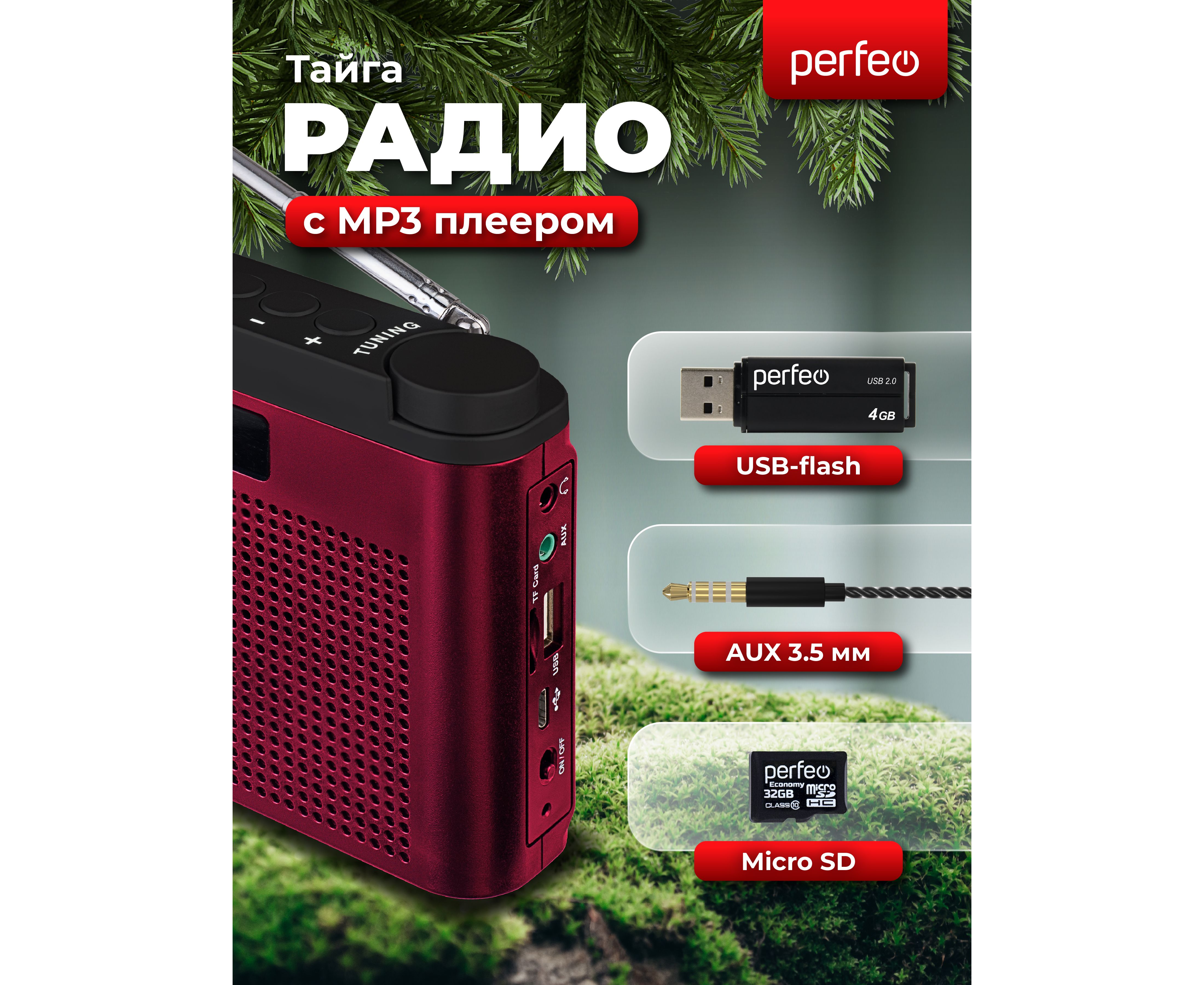 Радиоприемник цифровой Perfeo ТАЙГА FM+ 66-108МГц/ MP3/ встроенный аккум, USB/ Бордовый (I70RED), (Арт. PF_C4940)
