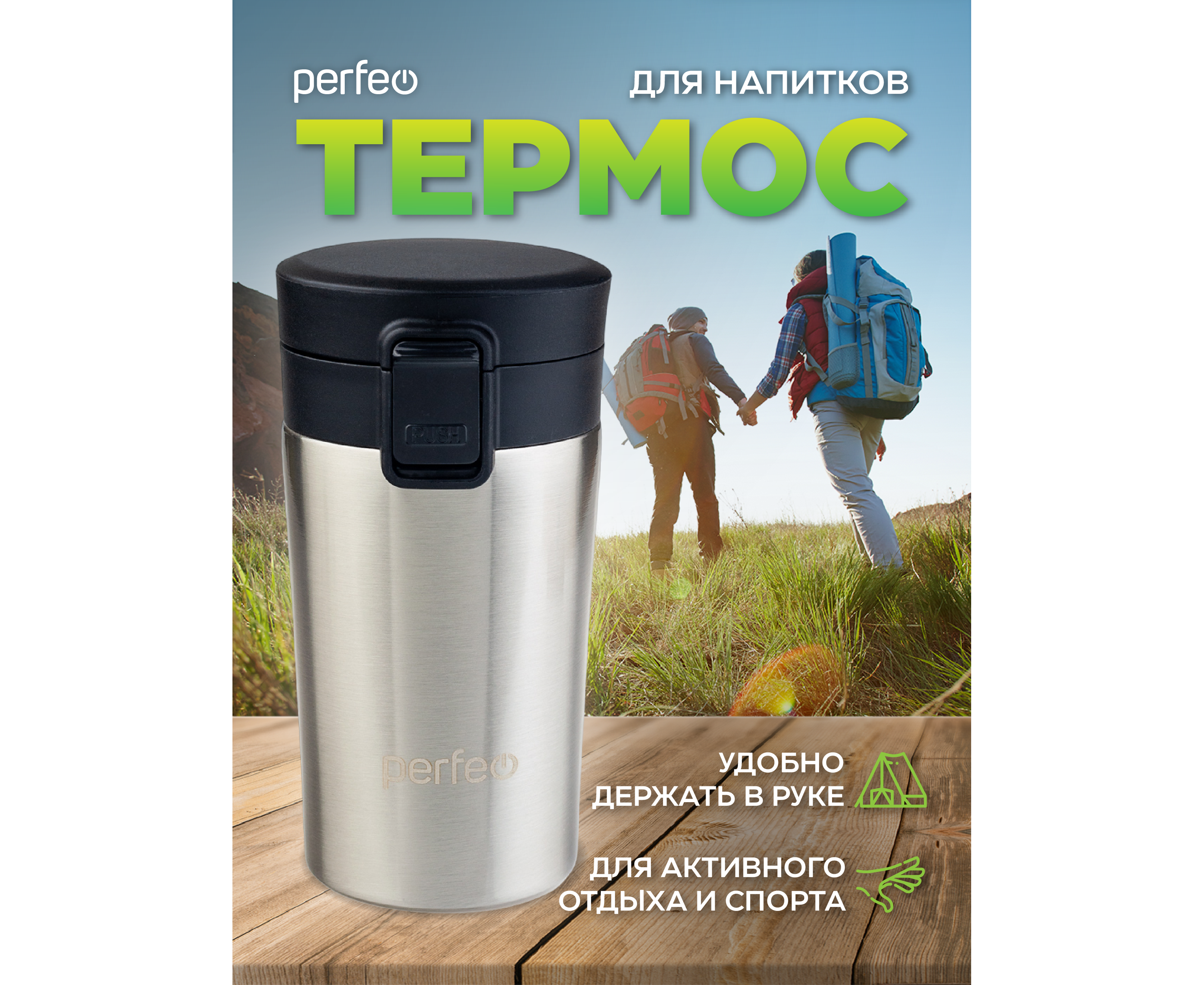 Термокружка для напитков PERFEO с крышкой-поилкой, ситечком, объем 0,25 л., нержавеющая сталь (PF_C3727)