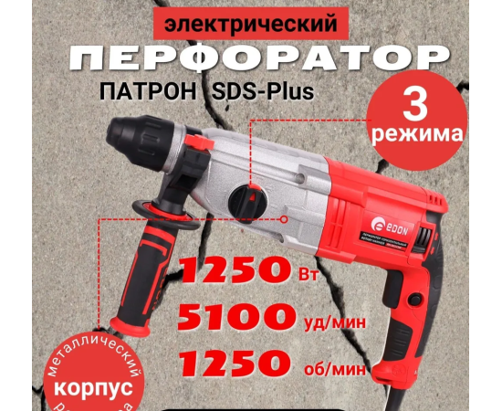 Перфоратор Edon RH-28/1250C – это электрический инструмент, который может работать в трех режимах: сверление, сверление с ударом и удар. Оснащен патроном SDS-plus и в качестве рабочего инструмента может использовать насадки с хвостовиками для патрона SDS-plus.