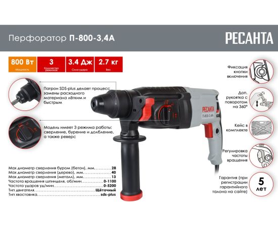 Перфоратор Ресанта П-800-3,4А станет незаменимым помощником при любом ремонте. Без него не обойтись, если нужно повесить полку на бетонную стену. Качественные материалы, надежный двигатель делают использование перфоратора приятным и долгим.