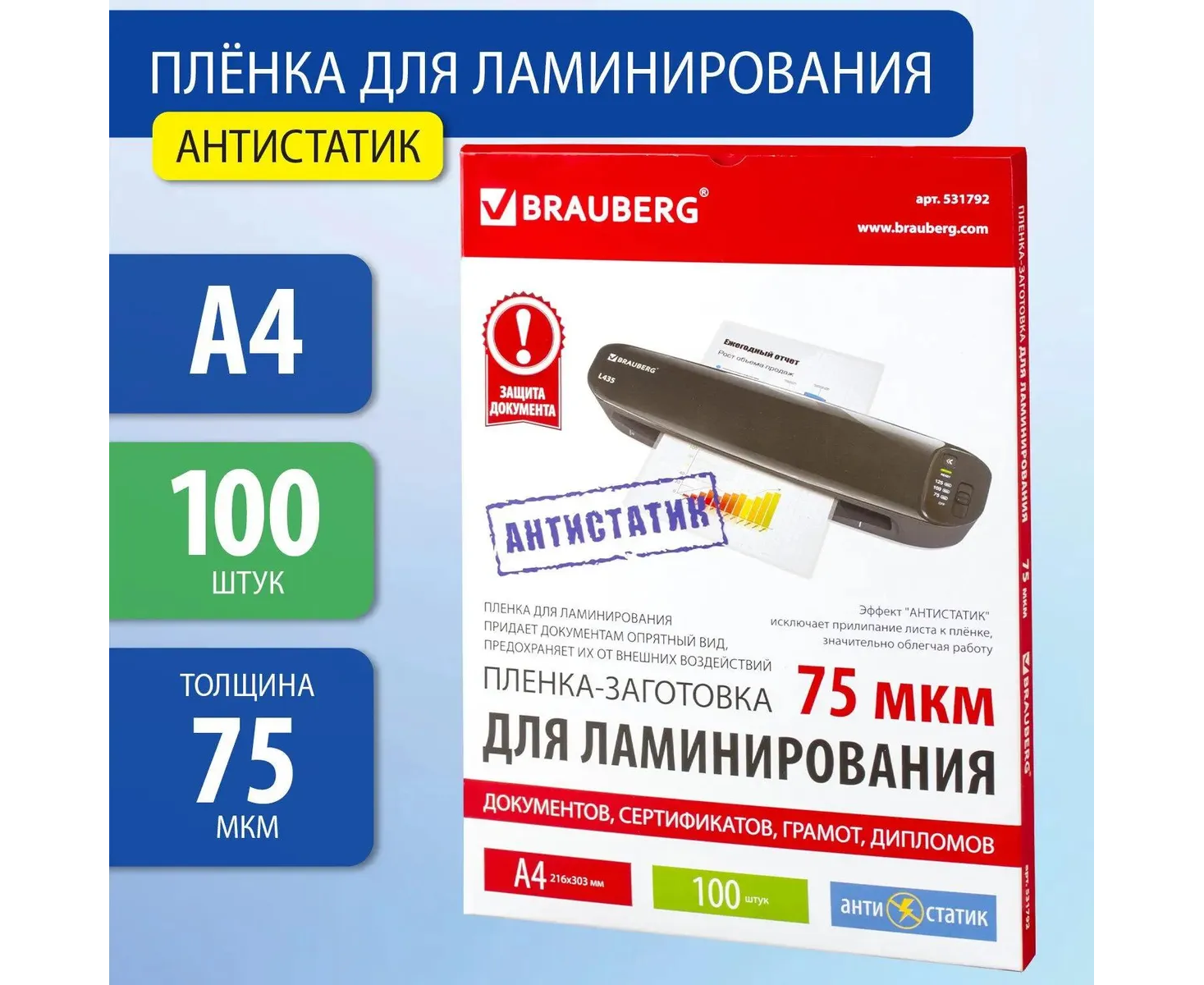 Пленка для ламинирования BRAUBERG 531792 75мкм 303х216 мм 100шт глянцевая A4