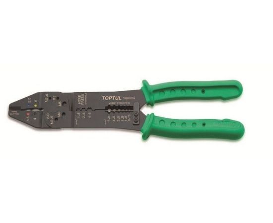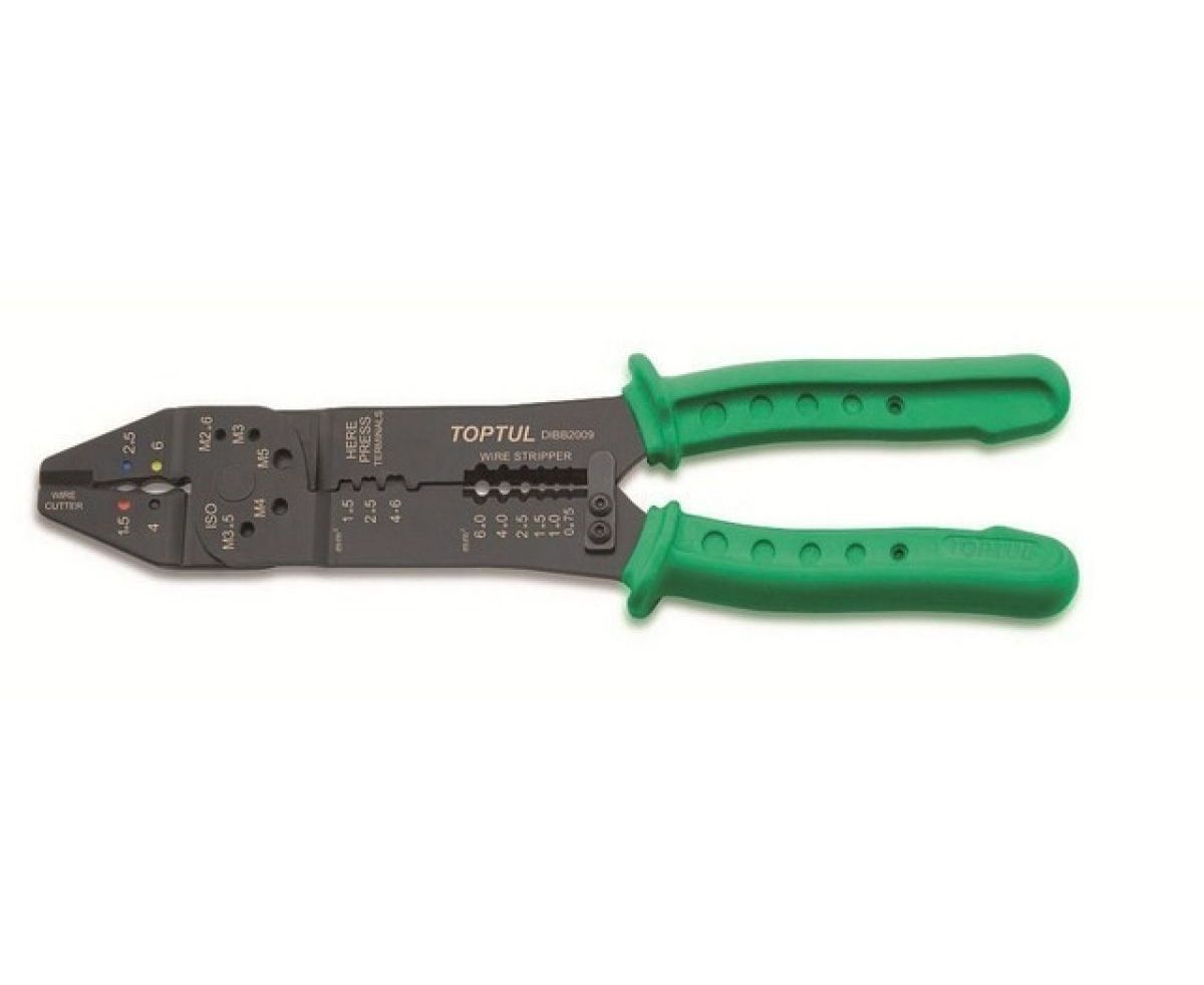 Пресс-клещи для обжима клемм и снятия изоляции TOPTUL (DIBB1009) предназначен для электротехнических работ. Используется для перекусывания проводов и изоляции, обжимки клемм. На рабочую поверхность инструмента нанесена специальная разметка, позволяющая регулировать длину изолируемого провода. Рабочие диаметры для обжима изолированных клемм: 1,5; 2,5; 4; 6 мм². Рабочие диаметры для болтореза: М2,6; М3,5; М4; М5. Рабочие диаметры для обжима неизолированных клемм: 1,5; 2,5; 4-6 мм². Рабочие диаметры для зачистки проводов: 0,75; 1,0; 1,5; 2,5; 4,0; 6,0 мм².