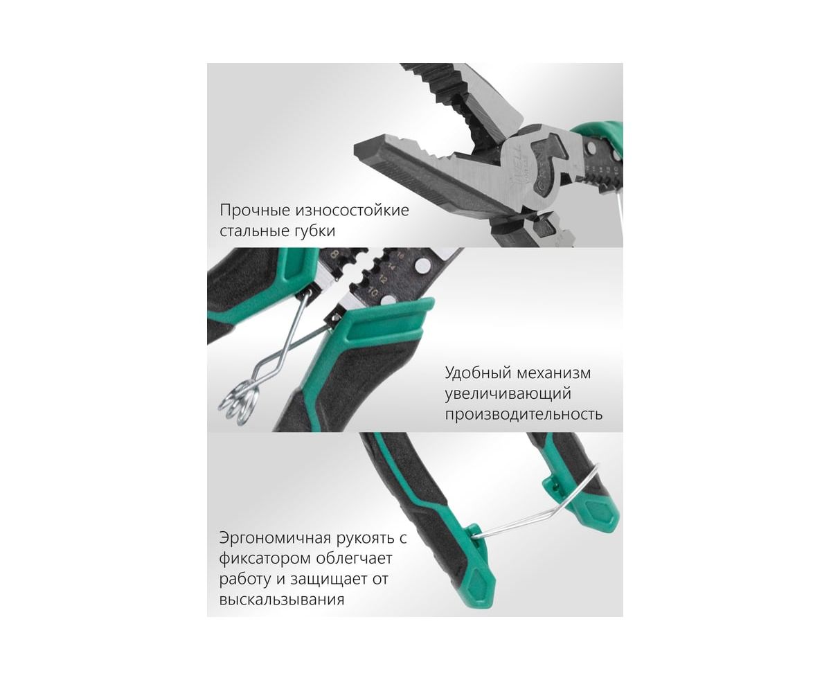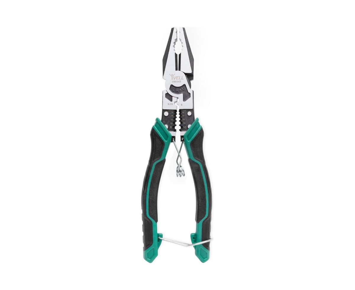 Современные плоскогубцы многофункциональные торговой марки Vell длиной 215 мм - инструмент для выполнения различных работ, включающий в себя: плоскогубцы, тонкогубцы, бокорезы, инструмент для зачистки кабеля, резак для проводов, напильник, инструмент для обжима клемм. Эксплуатируются для монтажных работ, в быту, для ремонта автомобилей, мотоциклов, механизмов и т.д. Режущие кромки закалены токами высокой частоты. Эргономичная двухкомпонентная ручка дает удобное размещение в руках во время работы и защищает кисть от различных повреждений. Инструмент многофункционален и имеет следующие возможности: обжим, зажимка, зачистка, откручивание, перекусывание.