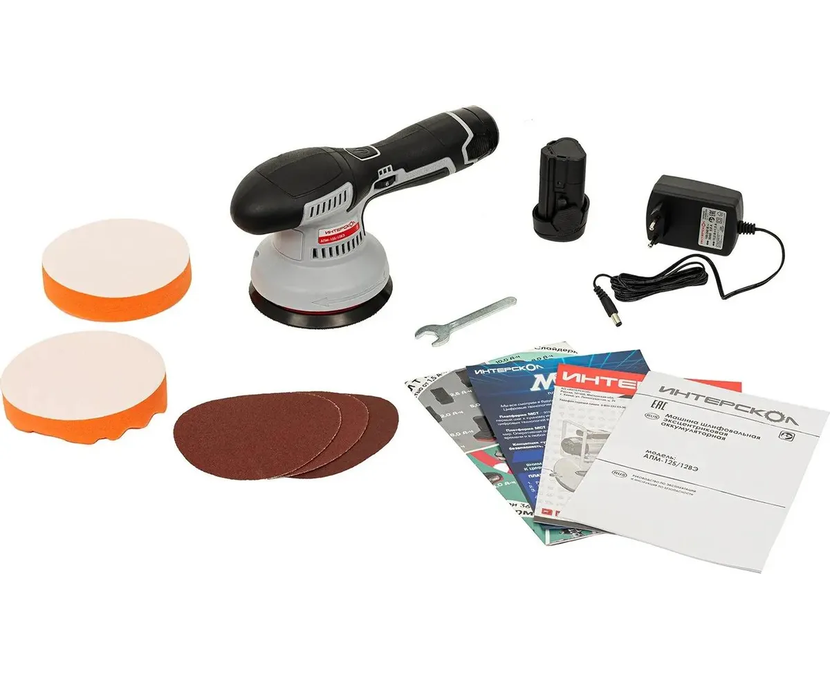Аккумуляторная полировальная машина, аккумуляторный блок БА-2/12 - 2 шт., зарядный блок ЗУ-2/12, поролоновый полировальный диск с креплением velcro - 2 шт., шлифовальный лист с креплением velcro - 3 шт., ключ S14, упаковка, руководство по эксплуатации и инструкция по безопасности