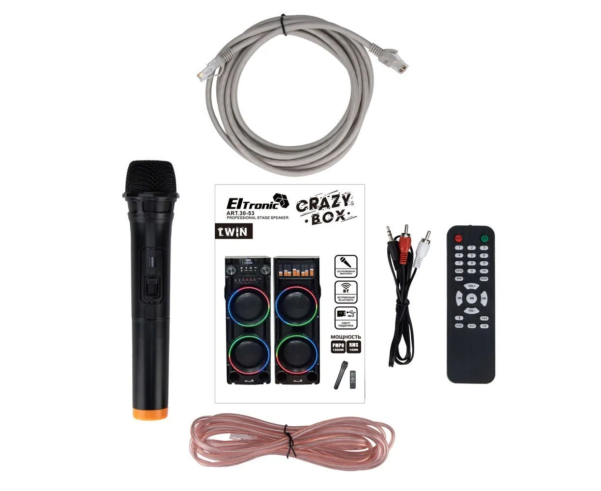 Мощнейшая акустическая система Eltronic 30-53 идеально подойдет для ресторанов, банкетных залов, клубов, проведения мероприятий или для занятия вокалом. Суммарная мощность колонок 300Вт (по 150Вт на колонку). В комплекте идет 1 беспроводной микрофон.