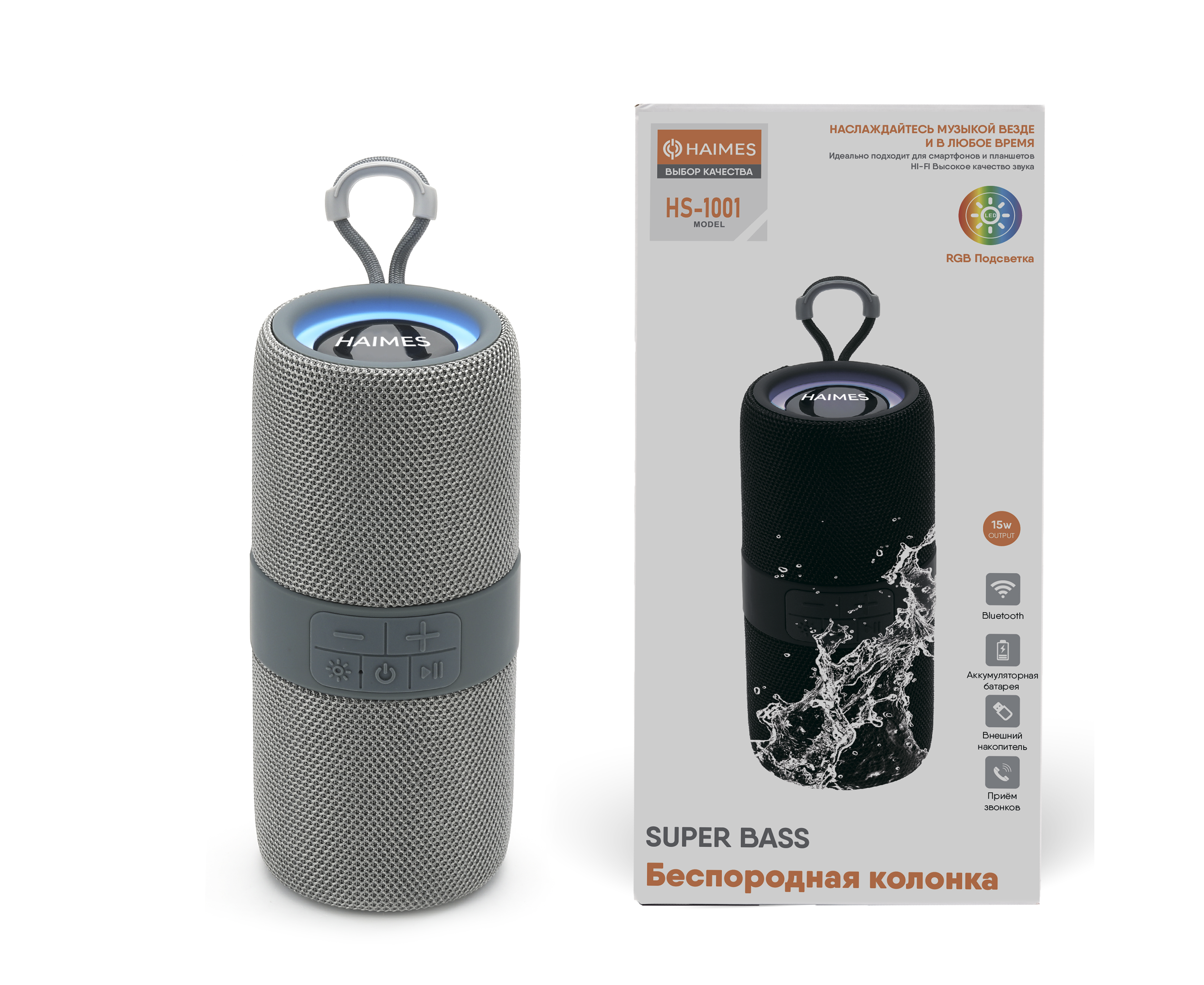 Портативная колонка TWS, 15Вт, АКБ 1200мAh, RGB-подсветка, HAIMES HS-1001