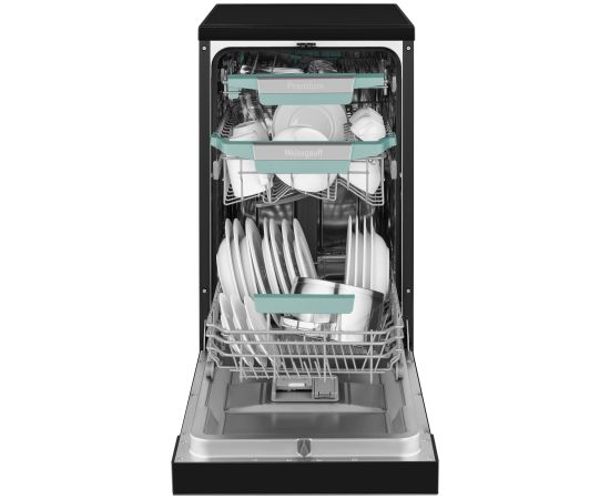 Узкая отдельностоящая посудомоечная машина Weissgauff c корпусом, выполненным в черном цвете с инновационным цветным дисплем SMART SCREEN с сенсорным управлением, инверторным двигателем и функцией автоматического открытия дверцы, не только сэкономит место на вашей кухне, но и обеспечит идеальный результат: 3 корзины позволят расположить посуду оптимальным образом для достижения наилучшего качества мытья, а вместимость посуды до 10 комплектов - это не только экономия места на кухне, но и отличное качество мытья вашей посуды.