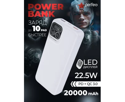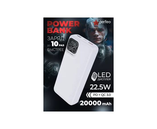 Повербанк Perfeo Atomic Age 20000 mAh/LED дисплей/PD + QC 3.0/Type-C/2 USB/Выход: 5A, max 22.5W/ Белый
