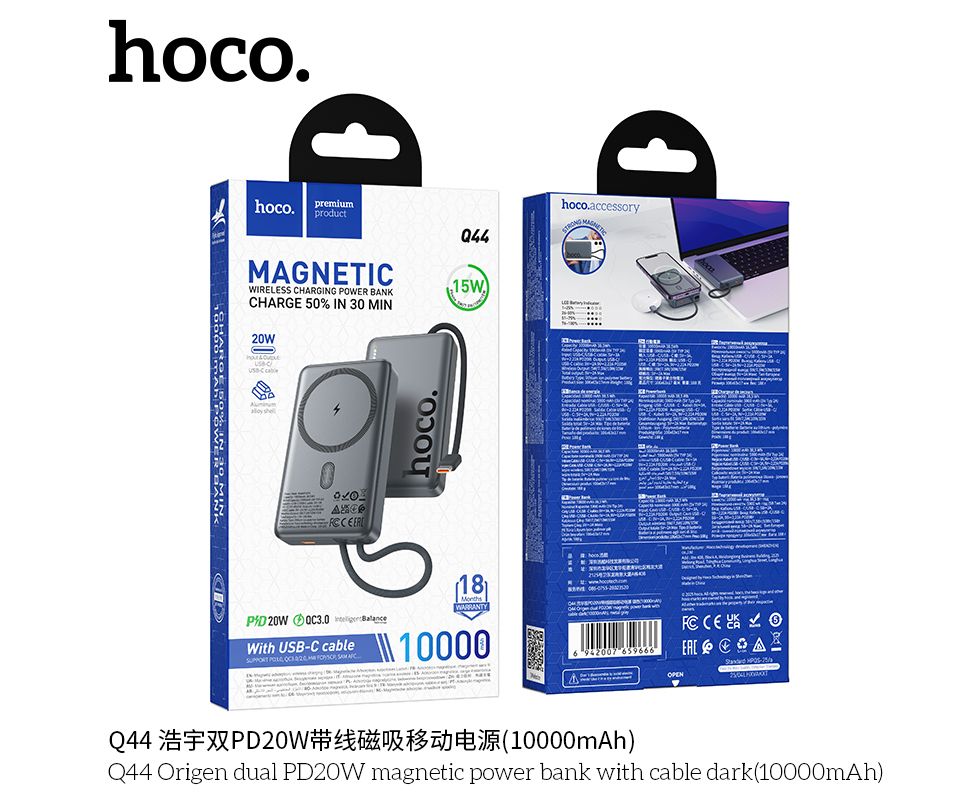 Power Bank Hoco Q44 Origen dual PD20W magnetic power bank with cable dark(10000mAh) metal gray