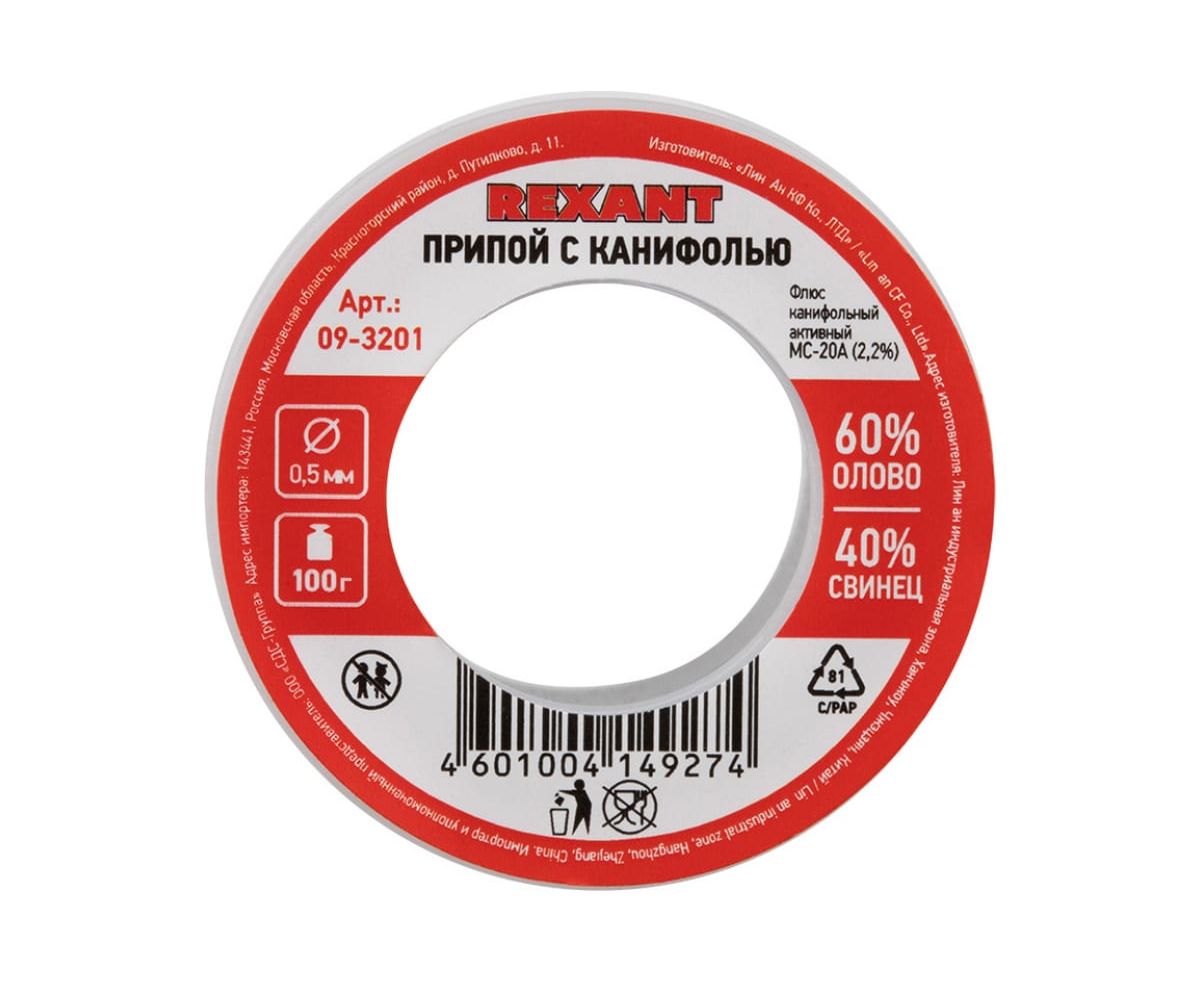 Припой с канифолью REXANT 09-3201 100г, 0.5мм, (олово 60проц., свинец 40проц.), катушка, блистер