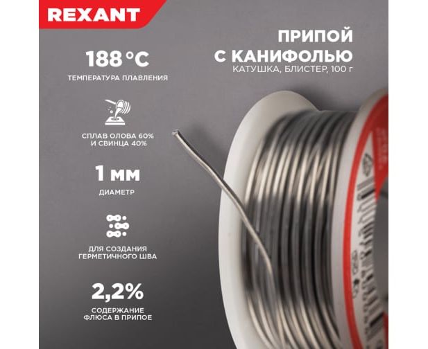 Припой с канифолью REXANT (09-3203) олово-60проц., свинец-40проц., 100гр, 1мм