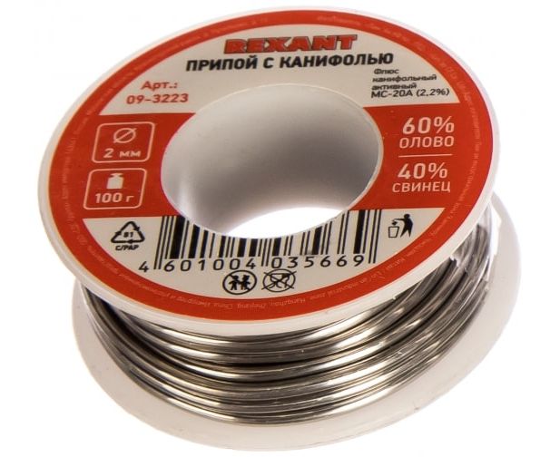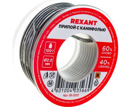 Припой с канифолью REXANT (09-3223) , 100 г, 2.0 мм, олово 60проц., свинец 40проц., катушка, блистер