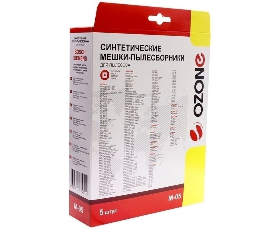 Мешки для пылесоса BOSCH (Бош), SIEMENS (Сименс), SCARLETT (Скарлет), KRUPS (Крупс), CONTI (Конти), PRIVILEG (Привилег), ENTRONIC (Ентроник), HANSEATIC (Хансетик), SEVERIN (Северин), PROFILO (Профило), SHIVAKI (Шиваки), UFESA (Уфеса). Мешки для пылесоса бренд OZONE, тип оригинального мешка: Typ G, синтетические. Мешок для пылесоса 5/10/15 шт. ВЫСОКИЙ УРОВЕНЬ ФИЛЬТРАЦИИ. Пылесборник для пылесоса одноразовый Ozone изготовлен из многослойного синтетического материала, способного качественно изменить вашу уборку. Пылесборник задерживает мельчайшие частицы пыли и мусора благодаря высокому уровню фильтрации. Мешок имеет ПРОЧНЫЙ МАТЕРИАЛ. Увеличенная прочность мешка, позволяет собирать все виды мусора, в том числе осколки стекла, гвозди, обеспечивая защиту внутренних элементов пылесоса. Мешки для пылесоса отличаются устойчивостью к воздействию жидкости. УВЕЛИЧЕННЫЙ СРОК СЛУЖБЫ. Снижают нагрузку на двигатель пылесоса, сохраняя постоянно высокую мощность всасывания и позволяют продлить срок службы турбины пылесоса. МИКРОФИЛЬТР В ПОДАРОК. Внутри каждой упаковки вложен 1 микрофильтр, своевременная замена которого позволит повысить качество уборки и эффективность работы техники.