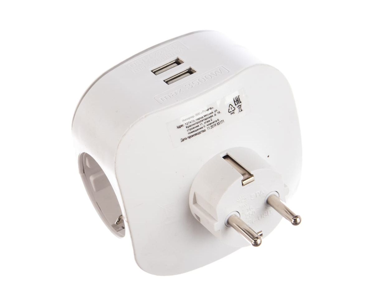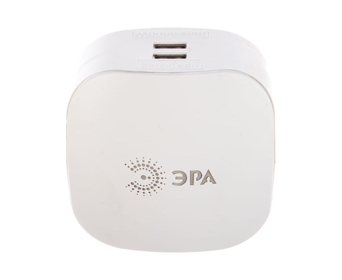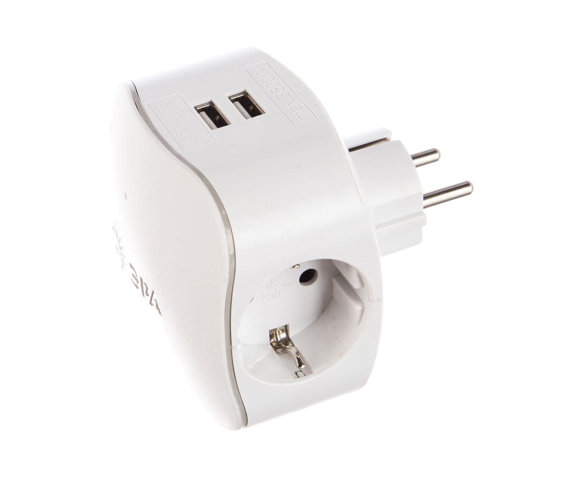 Тройник ЭРА SP-3e-USB-2A 3гн 220V + 2xUSB 2000mA, c заземлением, белый Б0015243 с 3-мя розетками и 2-мя USB гнездами для зарядки портативных устройств. Идеален для зарядки мобильных телефонов и планшетов. Незаменим с собой в дороге. Особенно актуален когда в помещении мало источников подключения - можно из одной розетки сделать три и при этом ещё заряжать 2 устройства одновременно через USB. Максимальная мощность USB разъемов: 2100 мА.