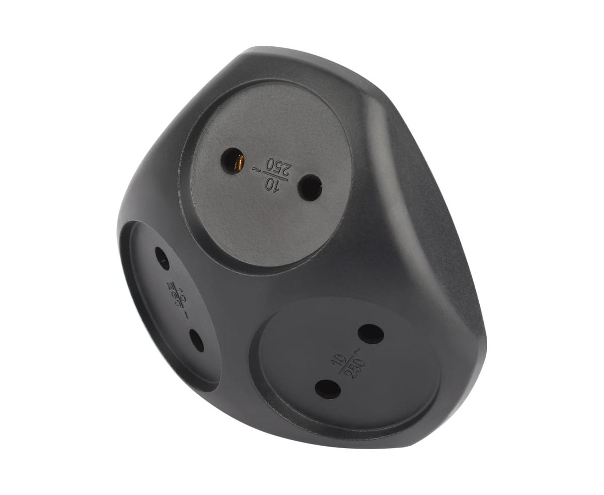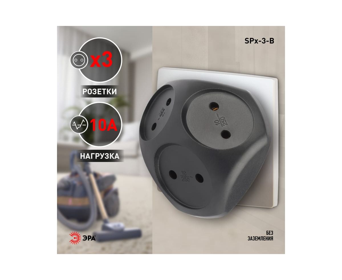 Сетевой разветвитель (тройник) ЭРА SPx-3-B на 3розетки, без заземления. Цвет-черный. Максимальная мощность - 10А/2200 Вт, материал корпуса - полипропилен (пластик премиум сегмента). Эксклюзивный продакт-дизайн.